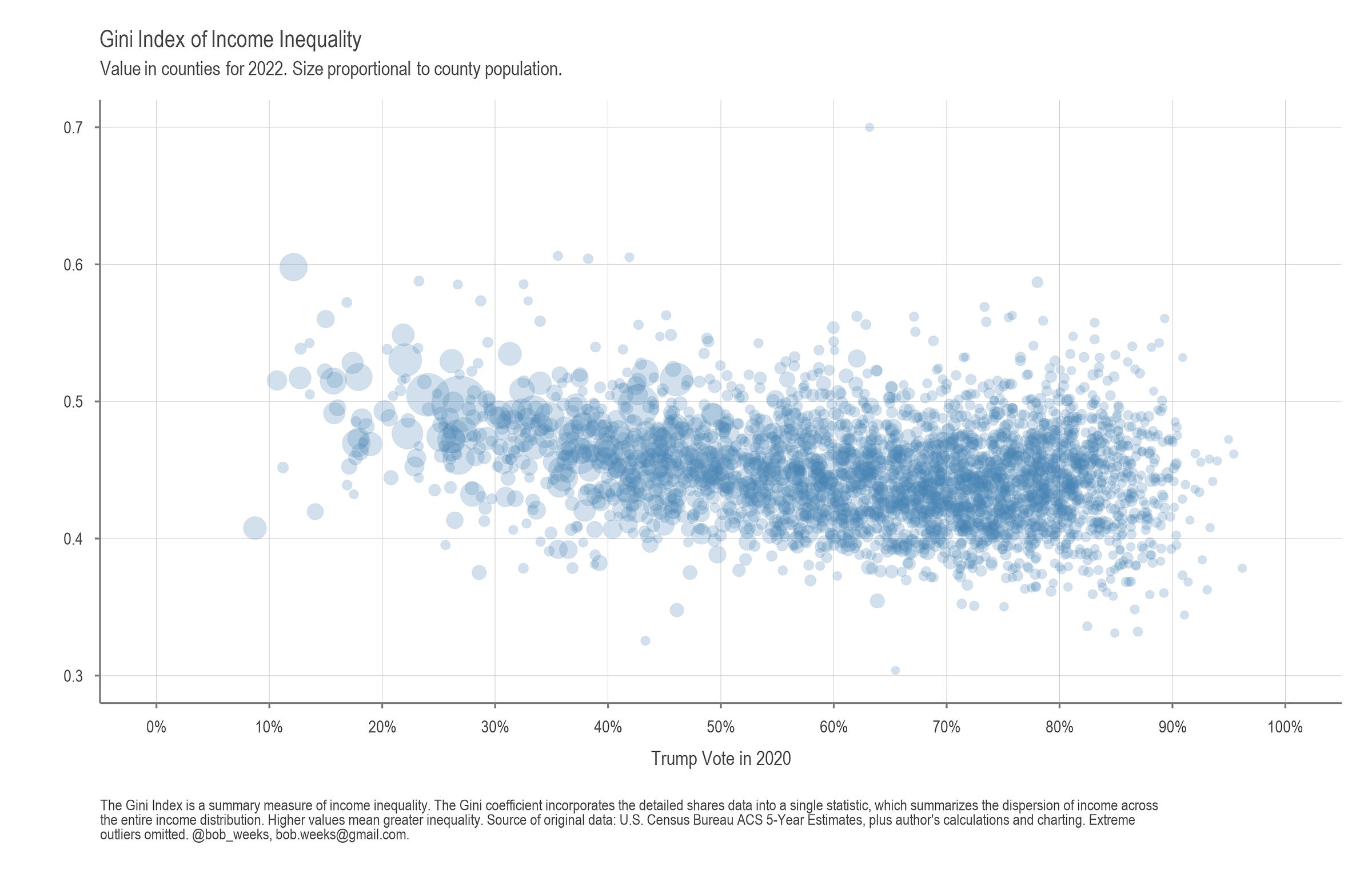 Some extreme outlying values omitted. Size of mark is proportional to county population. The horizontal axis is the percent of the county that voted in the 2020 general election for Donald J. Trump.